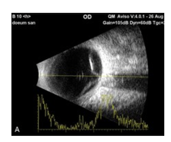 Du foretager en ultralydsskanning af øjet og får flg. billede på højre øje;