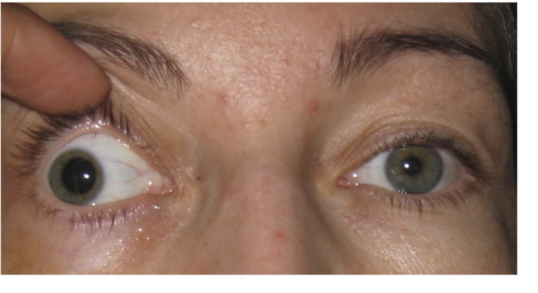 egen læge, grundet nyopstået ptose på højre øje (se billede). Hun er tidligere systemisk rask og heller
