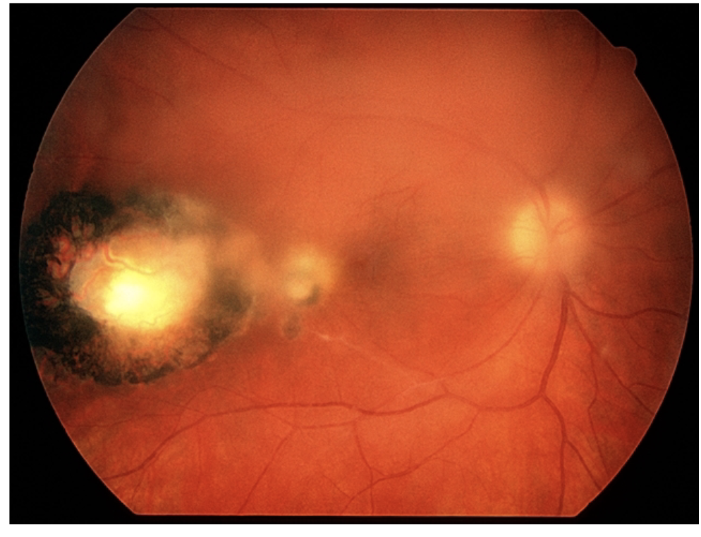 Patienten sendes akut til øjenlæge som ved oftalmoskopi ser dette: