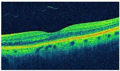 Husk på at man bruger OCT til AMD (våd) for at se efter ødem af makula (den gule plet–>et sted på retina, hvor der er høj tæthed af tappe og som sørger for vi kan se skarpt og nært).