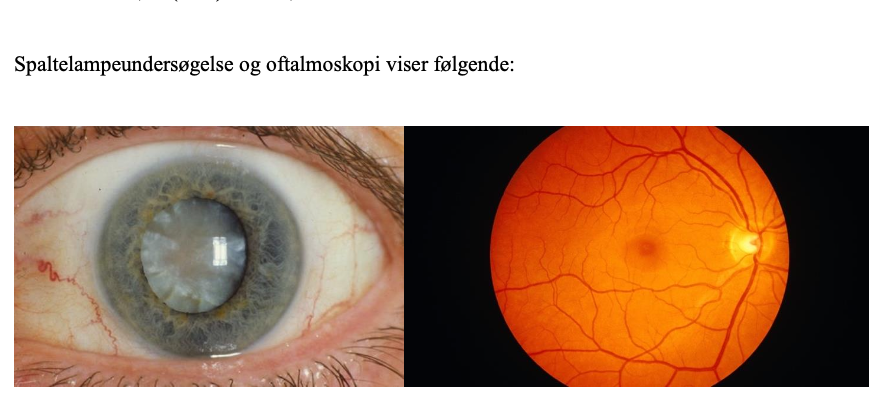 Du tilser en 83-årig kvinde på øjenafdelingen. Hun klager over tiltagende dårligt syn over det sidste år. Hun har især svært ved at læse avisen og bliver ofte blændet af modkørende bilister om aftenen. Desuden synes hun, at hun ser dårligere i mørke. Adspurgt har der ikke været smerter, rødmen i øjet eller metamorforpsier. Patienten bruger almindelige læsebriller, men ellers har synet altid været godt.