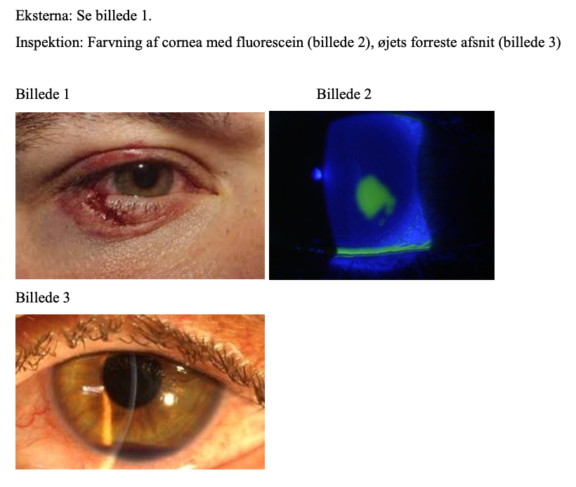 En 37-årig mand får ved et uheld en gren svirpet mod højre øje og pådrager sig en øjenlågslæsion, der sutureres på øjenafdelingen. Grundet korneal abrasio opstartes behandling med lokalantibiotika. Der er risiko for trykstigning i øjet grundet hyphaema. Der er endvidere risiko for reblødning, hvorfor der udskrives recept på mydriatikum, og patienten får en opfølgende tid til kontrol i øjenambulatoriet 3 dage senere.