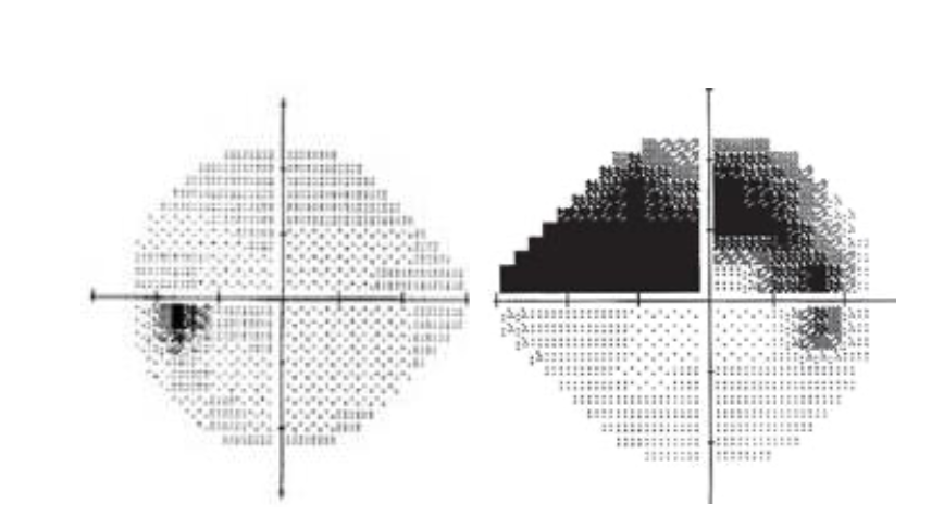 3 måneder efter ses patienten til kontrol efter synsfeltsundersøgelse (perimetri), som viser følgende (venstre øje: venstre tegning; højre øje: højre tegning):
