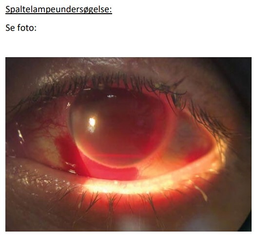 øje. Hun har ingen øjensmerter og ingen almen symptomer i øvrigt. Hun bruger briller pga. en bygningsfejl