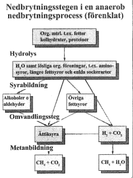 Nedbrytningsstegen i en anaerob nedbrytningsprocess (förenklat)