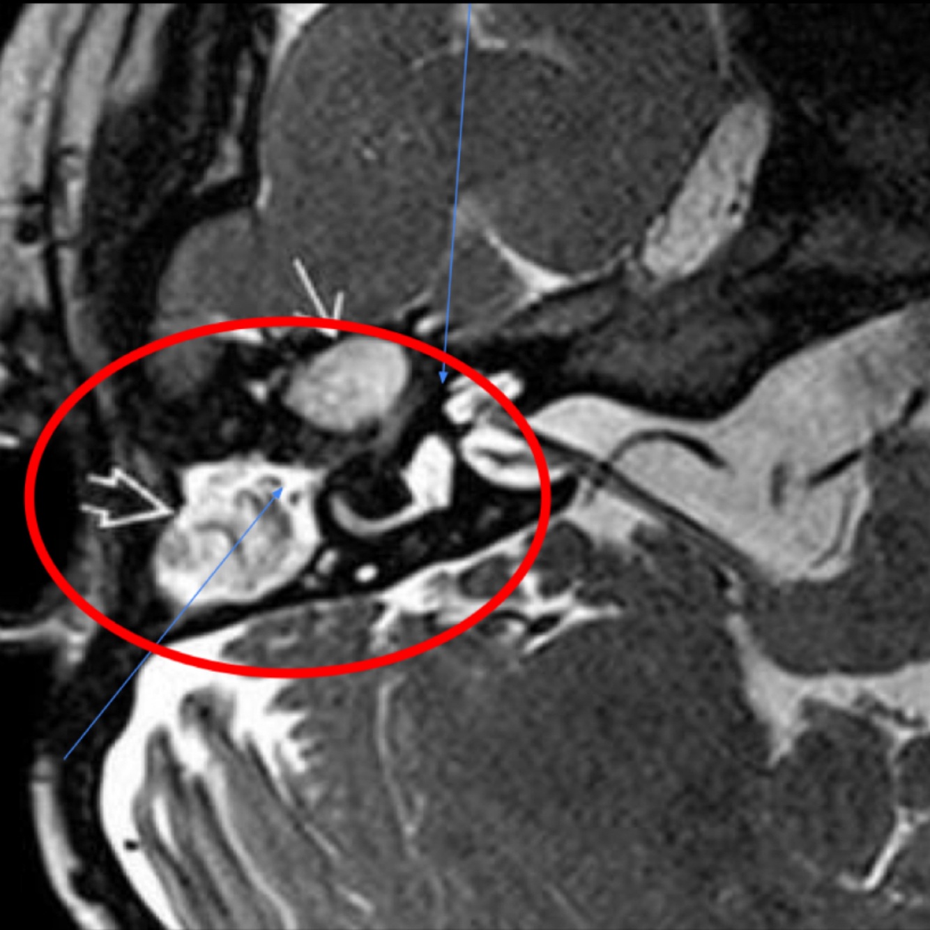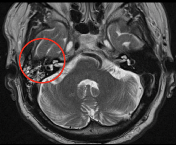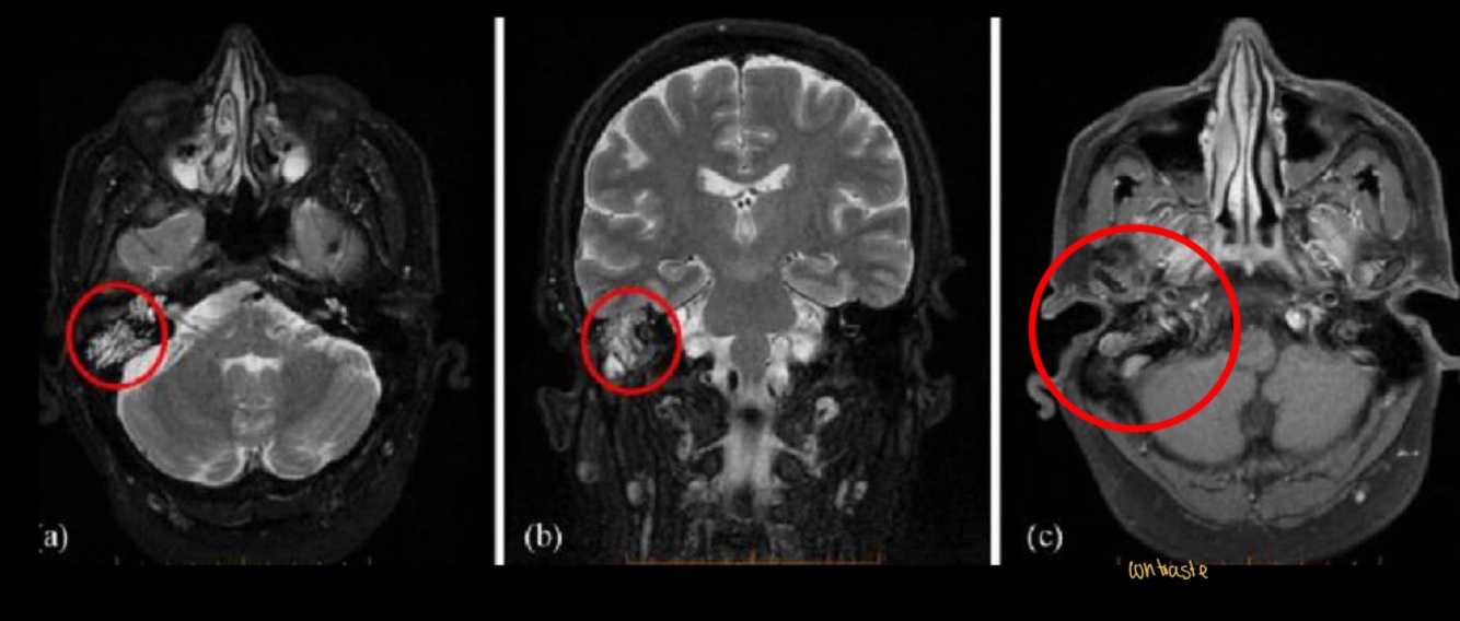 T2: masa híper intensa en oído y mastoides