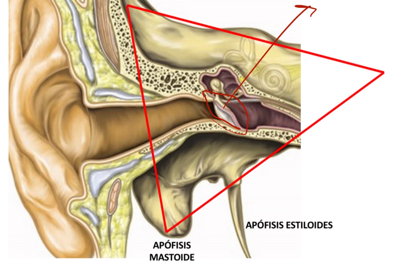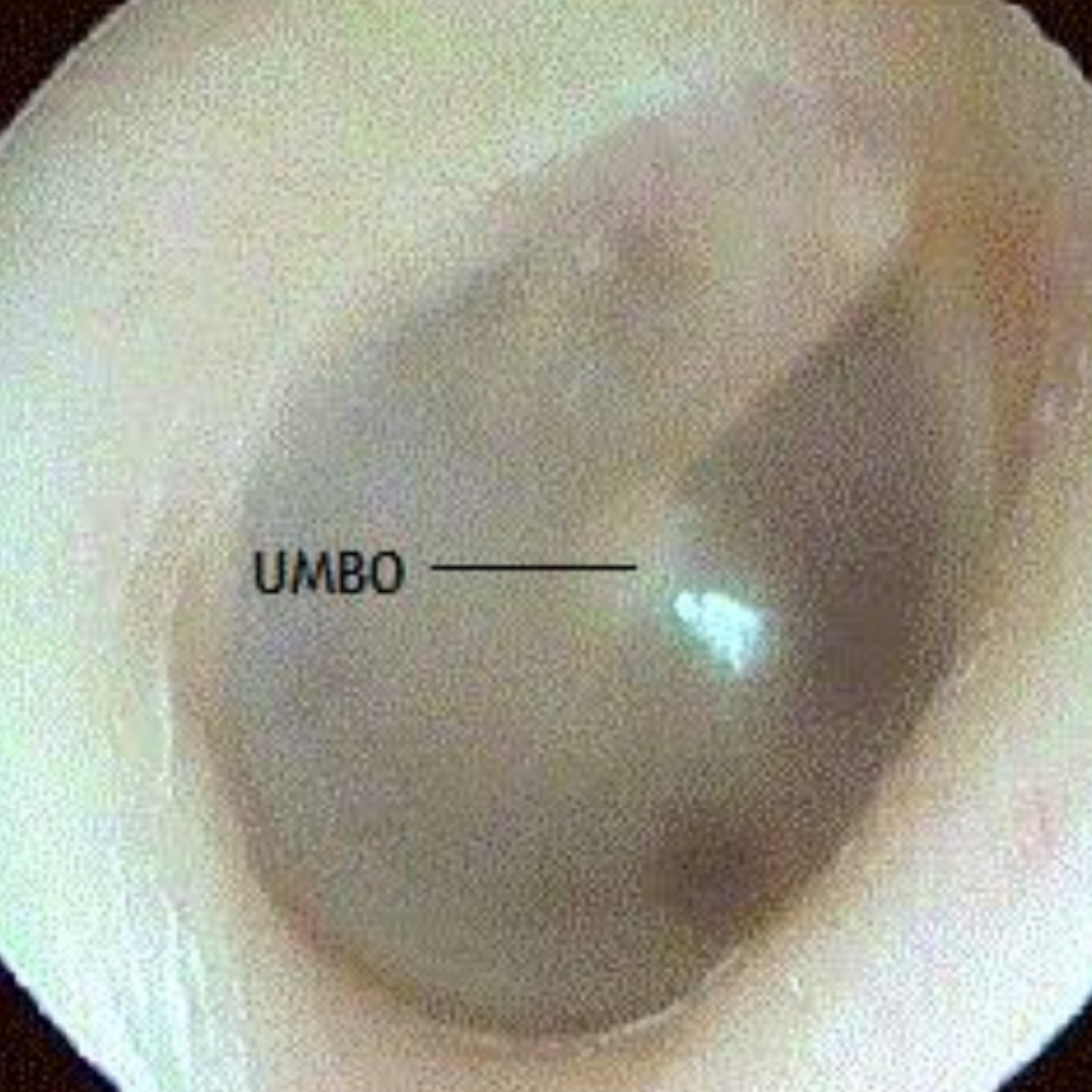 Se observa un triangulo luminoso en el cuadrante antero-inferior, que es un efecto lumínico que se observa al llegar a la membrana. Es el punto de hundimiento mas profundo. Cuando se llena de secreción membrana se abomba, provocando que solo se vea un punto