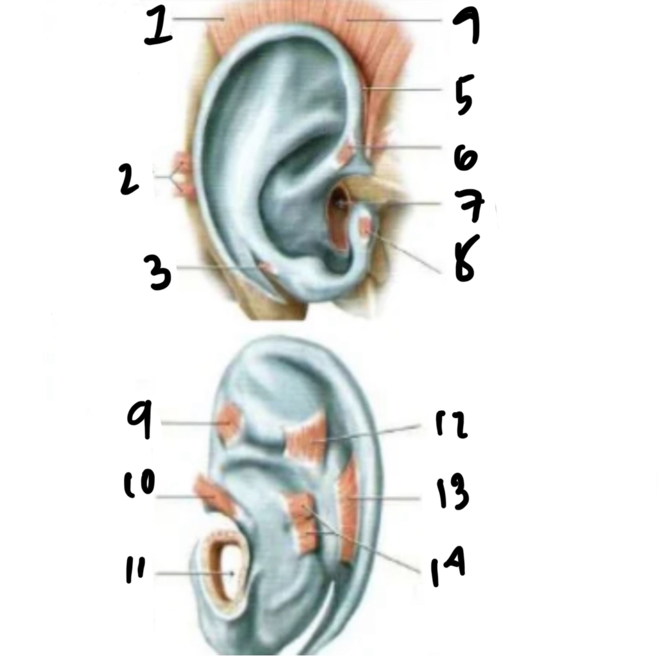 Son tres: músculo auricular anterior, superior y posterior. Son todos dilatadores del conducto auto vio externo y orientadores del pabellón auricular