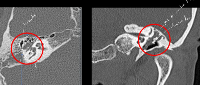 - masa bien definida en oído medio (densidad intermedia) + erosiones osiculares (o laberinticas)