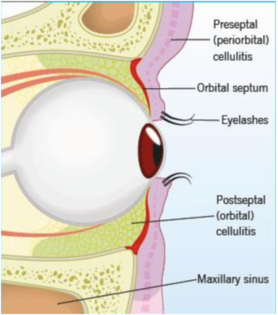 * 1: betændelse i øjenlåget FORAN septum orbitale
