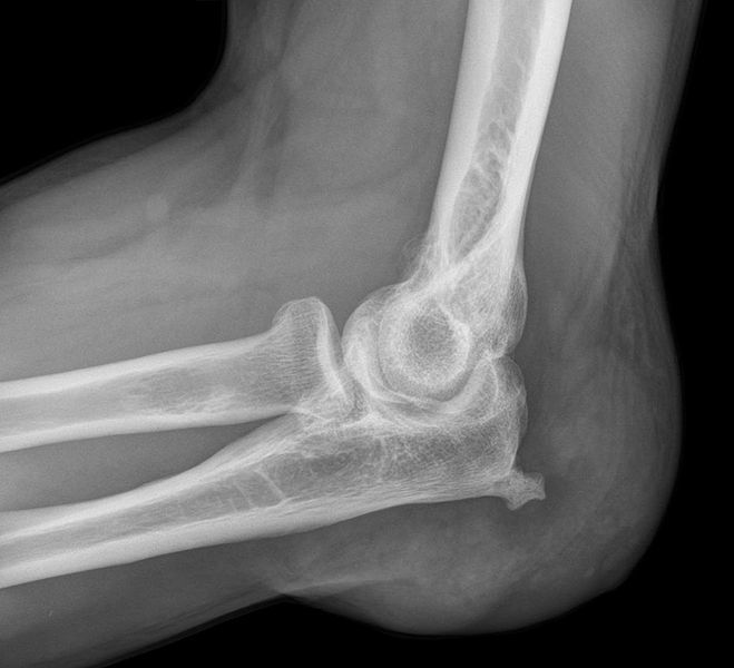 A plain film radiograph showing soft tissue swelling (with associated bony spur) from olecranon bursitis.