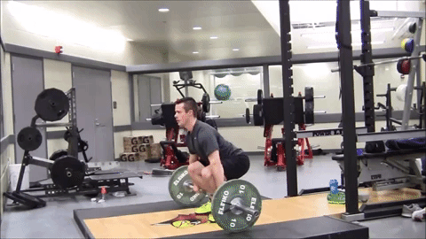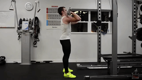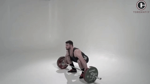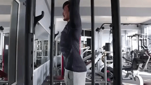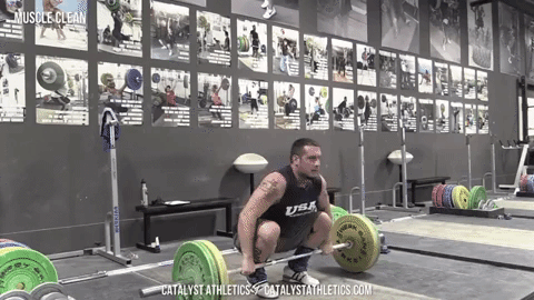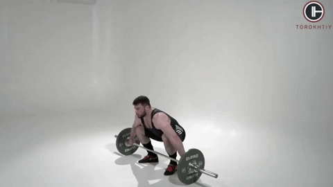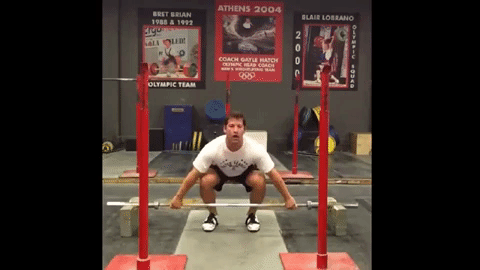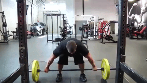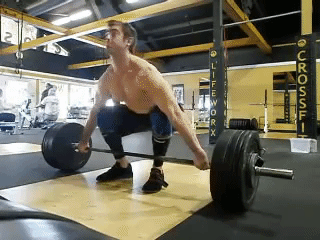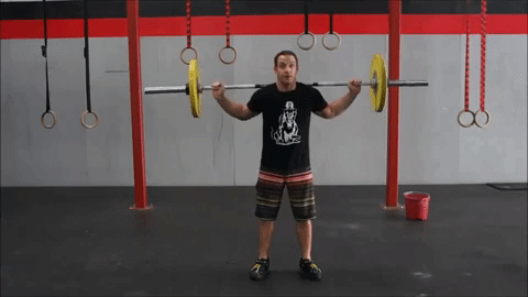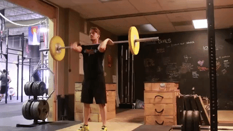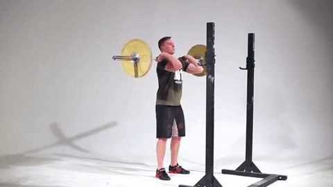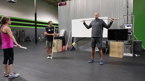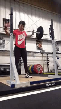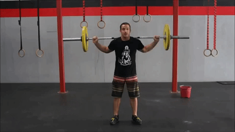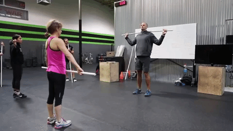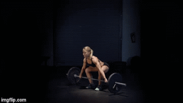 She raises bar and places behidn her back in clean grip position. Raises the bar up then back down