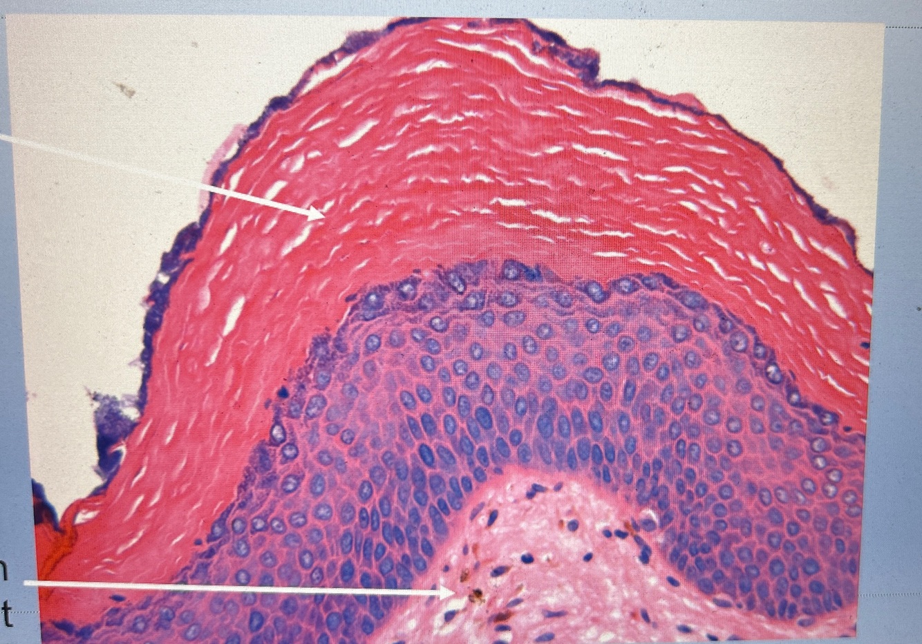 Smokers/traumatic histology- increased keratin(keratosis) and mucosal pigment