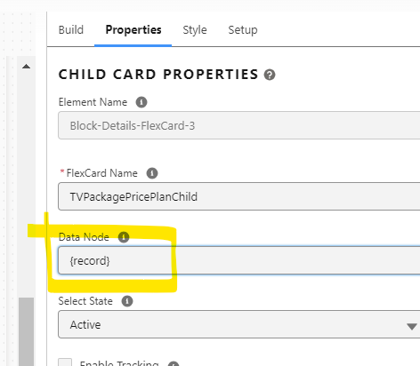 On a FlexCard canvas, several fields display with Salesforce data, but one of the fields shows only
