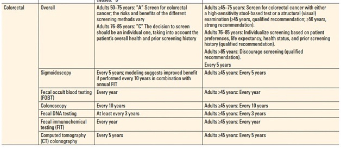 Choice A is part of the recommendations for average risk patients between 45-75 years of age.