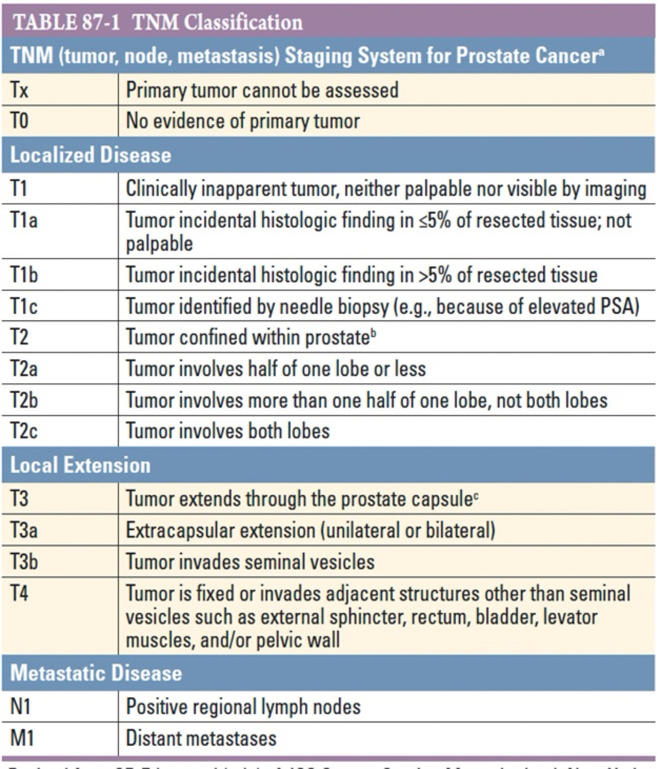 Answer is B. T3 indicates tumor beyond prostate capsule. T4 indicates spread to adjacent organs. N1 indicates spread to regional lymph nodes. M1 metastasis to distant organs