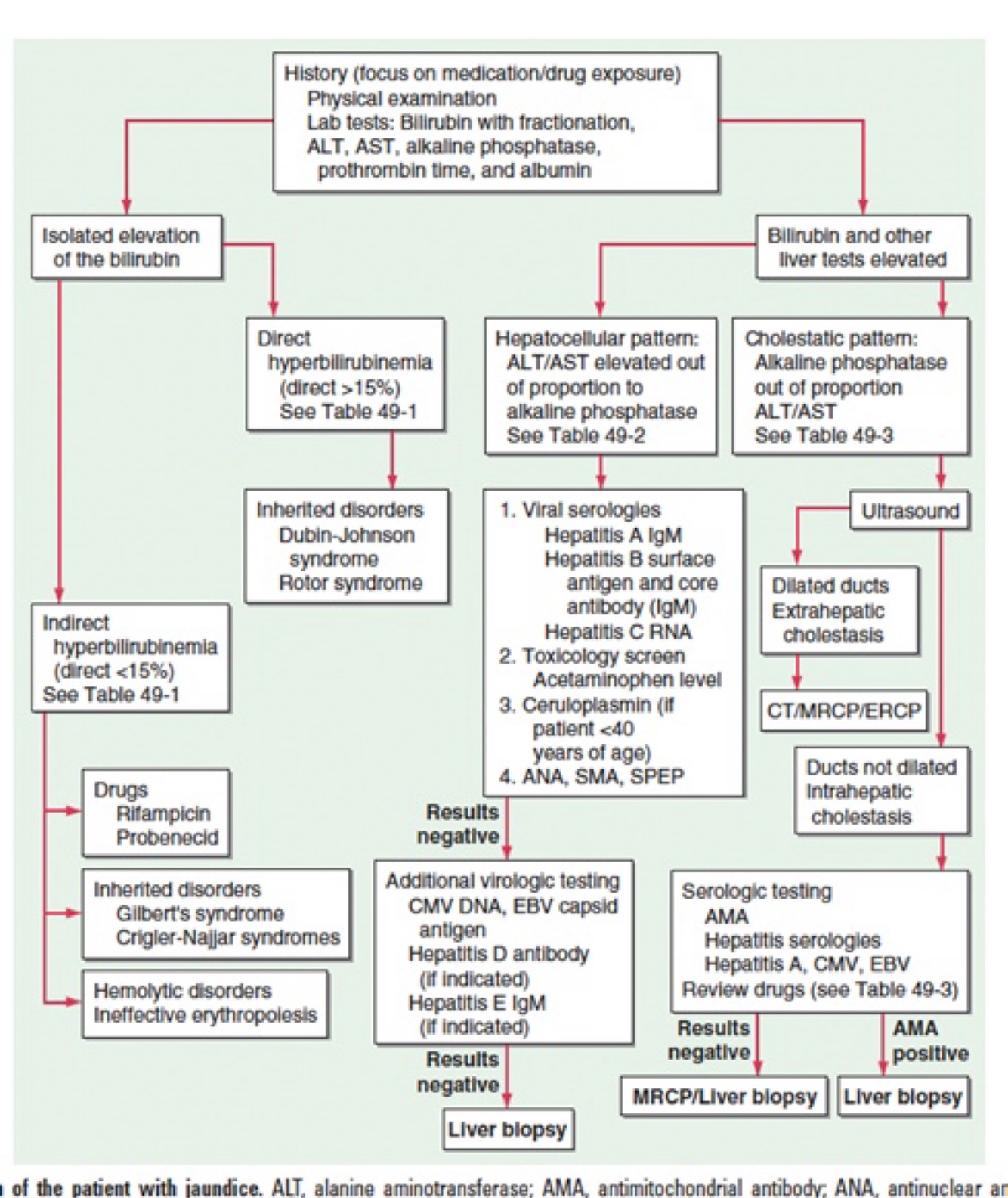Results show an obstructive type of jaundice (ALP elevation more than transaminases), and an intrahepatic cholestasis given the absence of biliary dilation.
