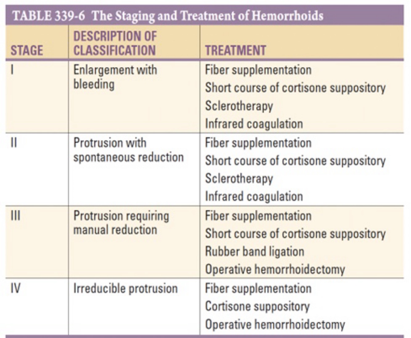 Table 339-6 in HPIM 22nd Ch339 summarizes the staging of hemorrhoids and their conventional treatment methods