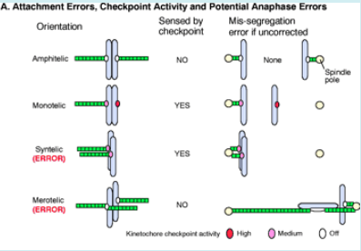 Microtububles attach incorrectly to chromosomes during mitosis. Microtubules are supposed to attached to single kinetochore. However, sometimes a microtubule can fail to attach (monotelic), or microtubules from one pole can attach to both kinetochores of the same chromosome (syntelic), or microtubules from both poles can attach to the same chromosome (merotelic).