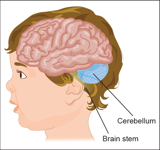 In the posterior part of the brain in the cerebellum or brainstem.
