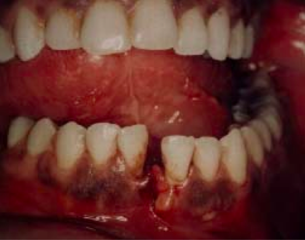 Åpen mandibelfraktur. Dette kan føre til infeksjon, må derfor igangsette AB for å motvirke mulig osteomyelitt, som kan føre til «non- union» eller at frakturen ikke gror etter operativ behandling (på tross av intern fiksasjon)