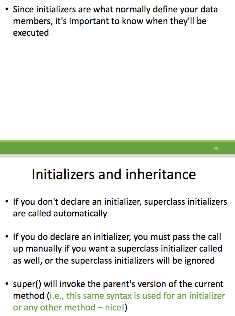 With regard to inheritance, how do initializers work? How do you call the super initializer, when is it done by default, when is it not done?
