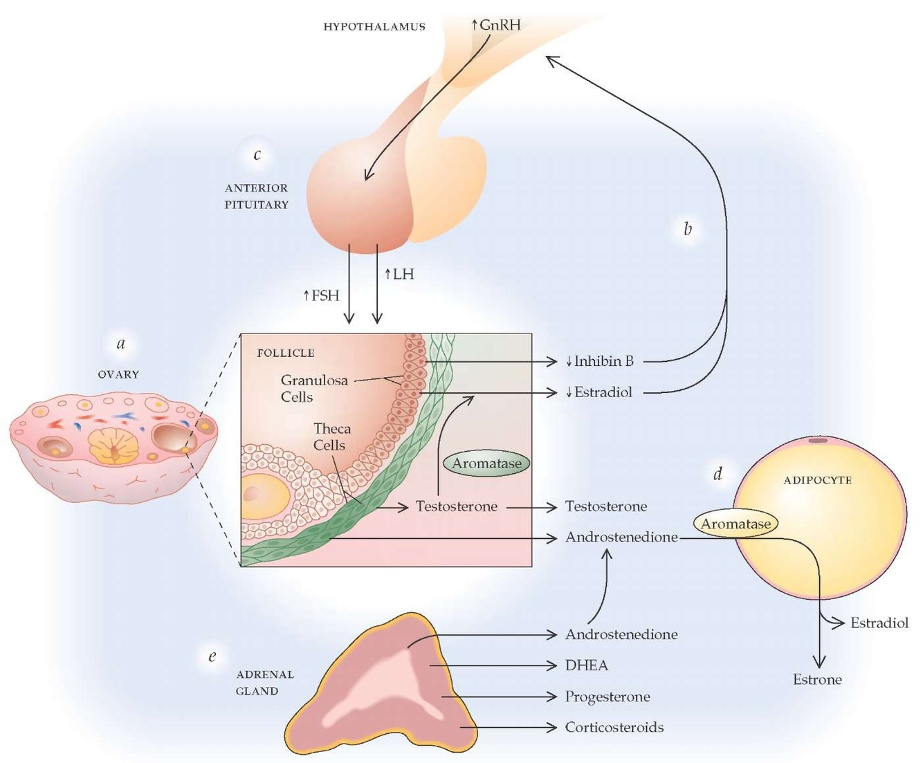 Theca cells develop LH receptors