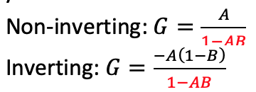 Non-inverting: G = -j / (1 + (-j × 1)) = -j / (1 - j)) G ≈ 1/√2