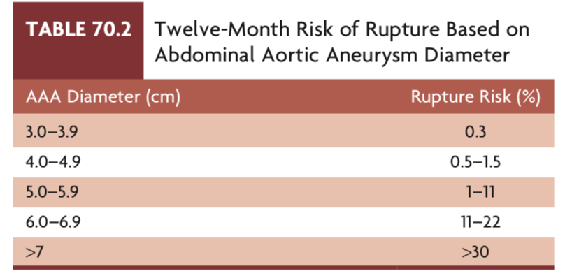 What is the 1 year risk of rupture of abdominal aortic aneurysms >7 cm?