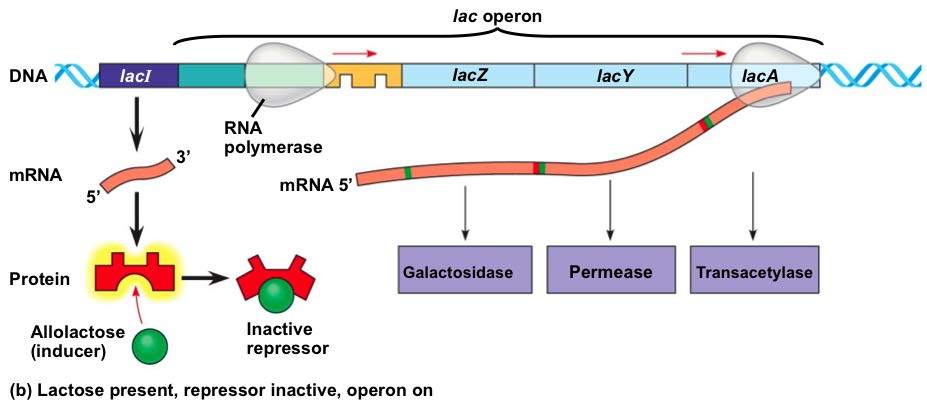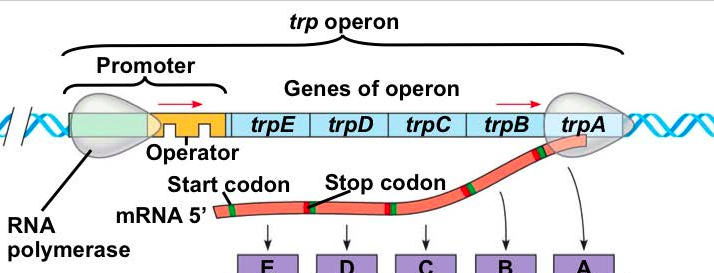 With the help of RNA polymerase, the genes at the end of the operon transcribe and translate into proteins that make up specialized enzymes. These enzymes complete specific tasks such as breaking down lactose or creating tryptophan