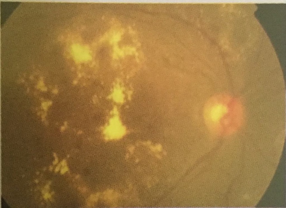 Deep yellow with sharp margins, often circinate Diabetes, hypertension, von Hippel Lindau disease, radiation