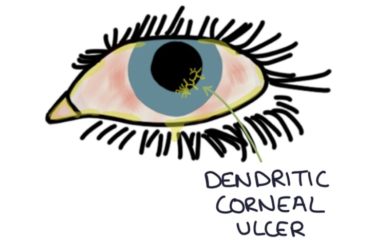 Diagnosis: slit lamp exam, fluorescein stain = dendritic (branching) corneal ulcer, corneal scrapings for viral testing