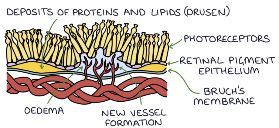 Drusen = yellow protein deposits, frequent + large indicates macular degeneration