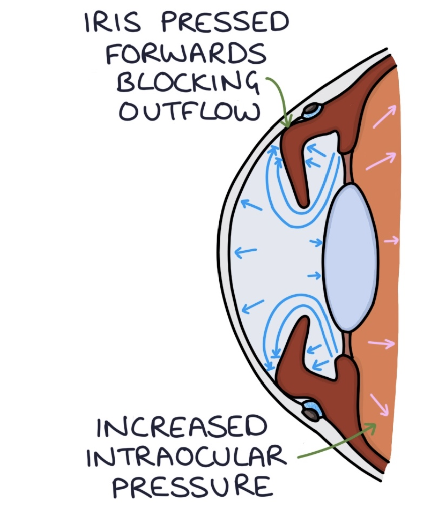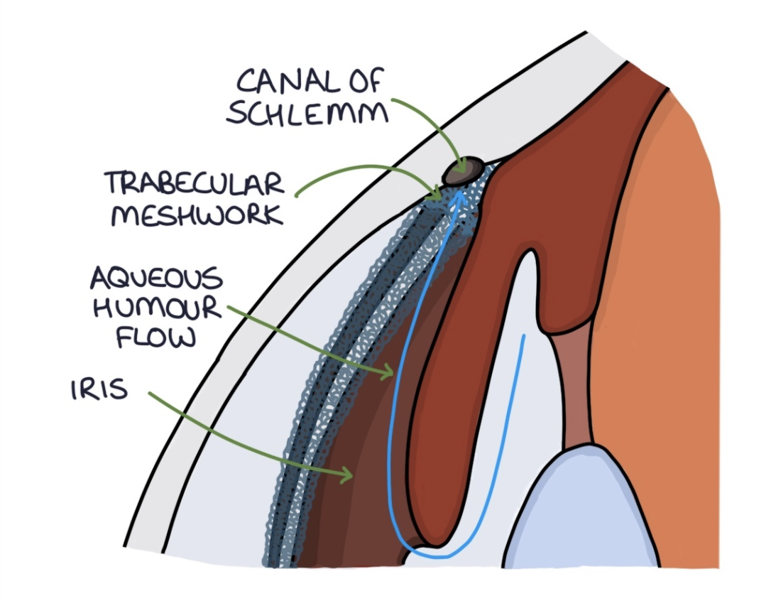 it is produced by the ciliary body and it flows around the lens under the iris, through the anterior chamber, through the trabecular meshwork and into the canal of Schlemm where it enters general circulation