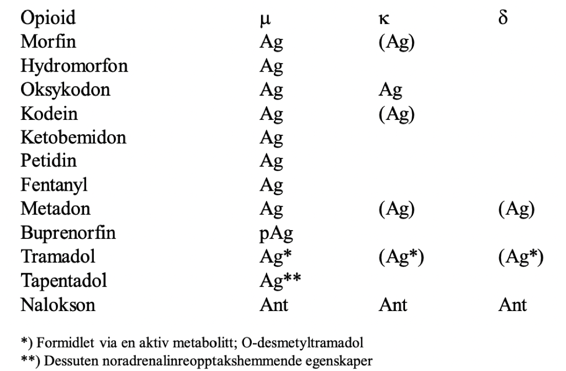 Hvilke av de ulike opioidpreparatene virker agonistisk (Ag)?