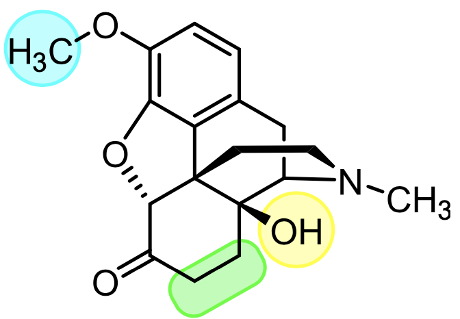 Oxycodone (cétone en 6 + hydroxyle ajouté position 14 et Me en position 3)