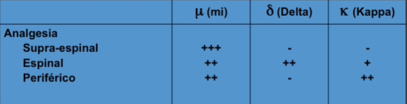 Relação entre os receptores opióides e o seu tipo de resposta nos eixos supra-espinal, espinal e periférico