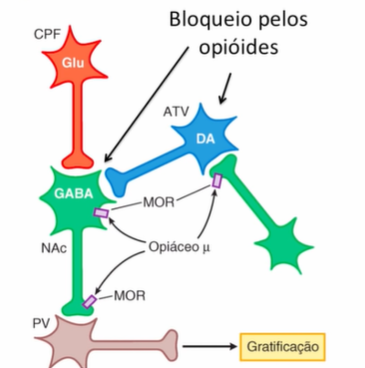 Opioides bloqueiam cortex préfrontal (glutamato) e área tegumenta ventral (dopamina) que ativam neurônios Gabérgicos que bloqueiam a função bloqueadora de gratificação do pálido ventral (PV)