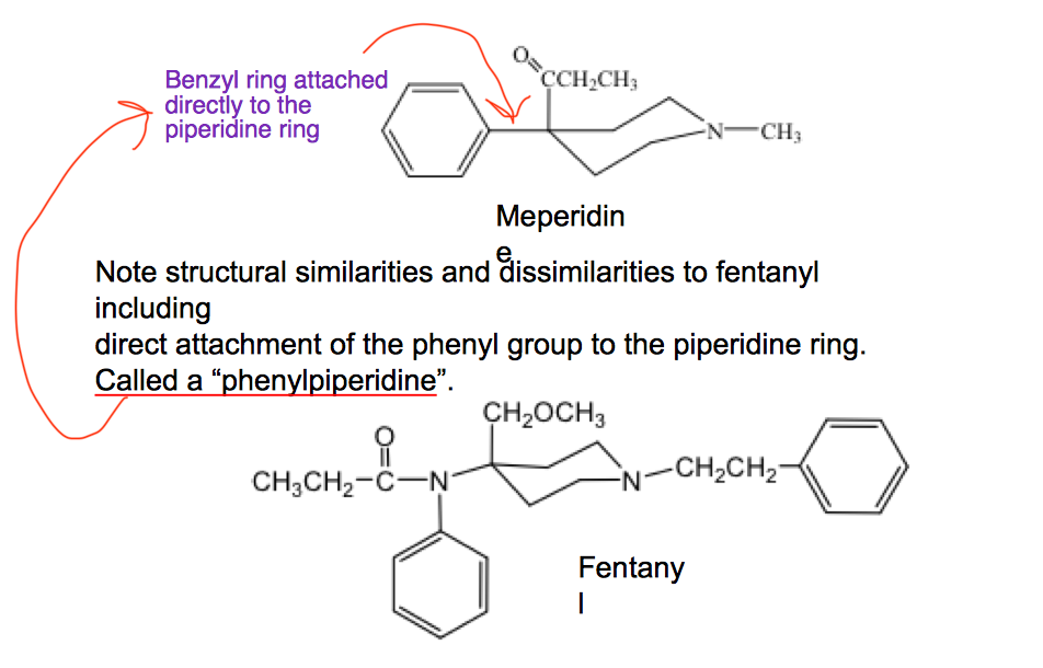 Note the presence of the phenyl and piperidine rings. Note the similarity of each compound except for the lipophilic side group.