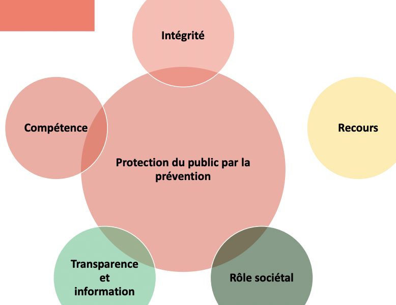 Il faut protéger le public par le biais de la prévention en faisant preuve d’intégrité (base de la confiance), de compétence, de transparence et d’information, de rôle sociétal (donner un point de vue expert au public). Aussi, recours: faire des enquête pour le patient (un autre à part)