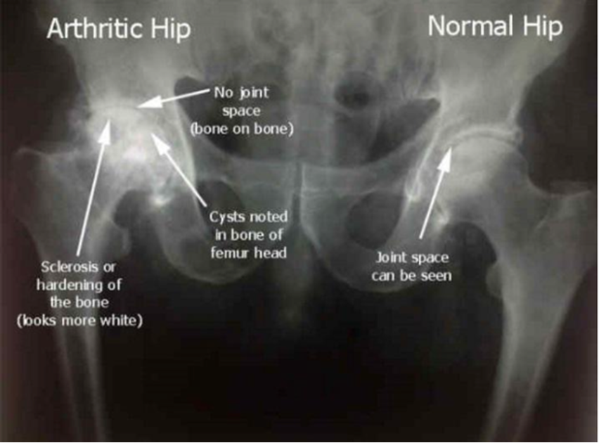 Rtg. bækken: afsmalnet ledspalte (brusken reduceret), subkondral sklerosering (kompakt knogle), osteofytter, subkondrale cyster, deformering