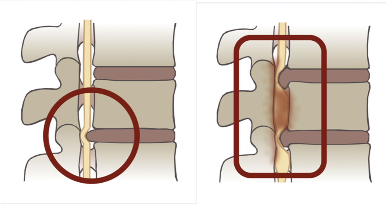 Spinalstenose (forsnævring af rygmarvskanalen) (hø.):