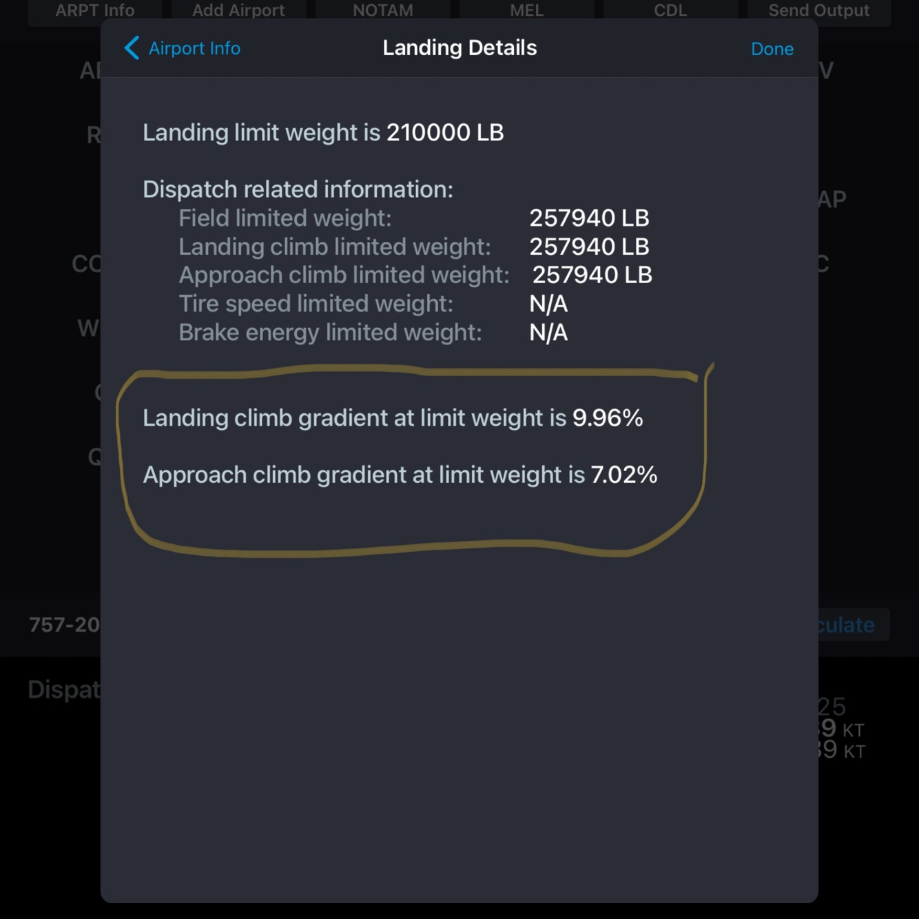 The landing climb gradient is based on all engines operating at takeoff thrust, full landing flaps deployed, landing gear extended, and the aircraft at maximum certificated landing weight.