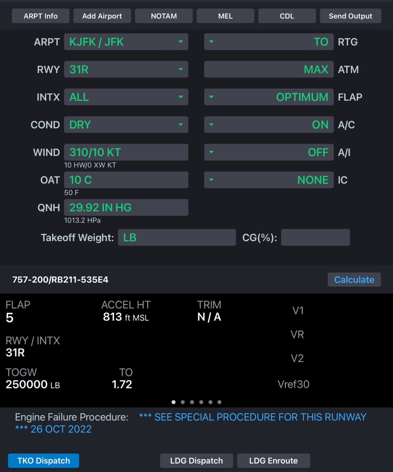 Each pilot will first enter the current conditions into the TKO Dispatch page then verify the MAXIMUM PERFORMANCE WEIGHT for the expected runway for departure. Both pilots will cross check the OPT data date for currency, the N- Number of the aircraft being used, the conditions entered into the TKO Dispatch page, and the maximum performance weight calculated by OPT. The FO will record this weight in box 2 of the Weight Data Record form.