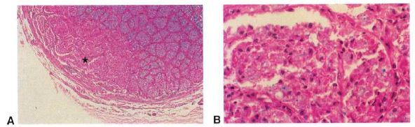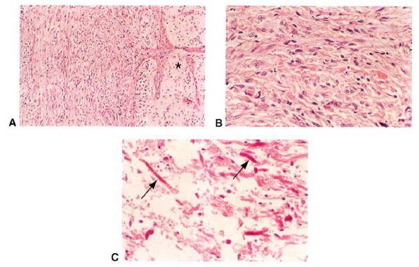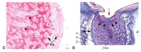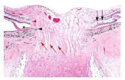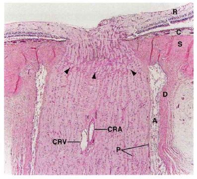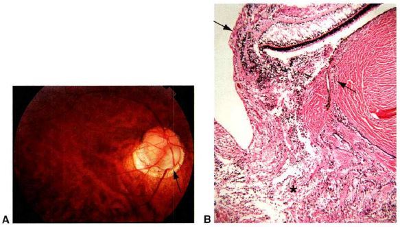 Optic nerve coloboma and a gliotic, disorganized retina and choroid terminate at the edge of colobomatous defect.