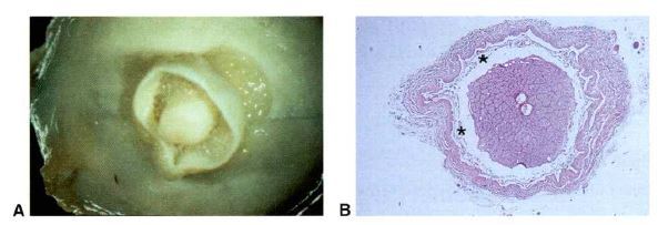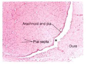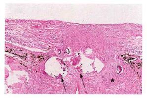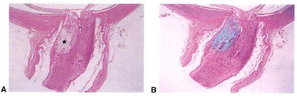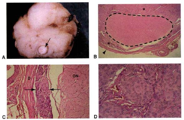Cystic atrophy within the optic nerve and cystic space filled with alcian blue-staining material.