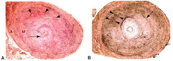 Giant cell arteritis and narrowed vascular lumen, numerous giant cells, and loss of the internal elastic lamina.