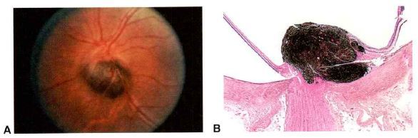 Melanocytoma of the ONH and a dome-shaped, jet-black mass involving the prelaminar optic nerve.