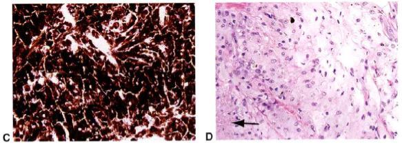A darkly pigmented polyhedral melanocytes and the area of necrosis within the tumor.