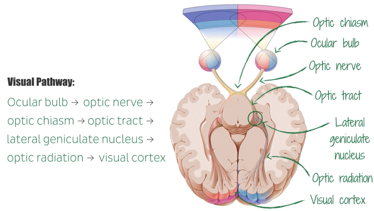 describe the visual pathway (beginning - light - ocular bulb-retina-optic nerve - chiasm)